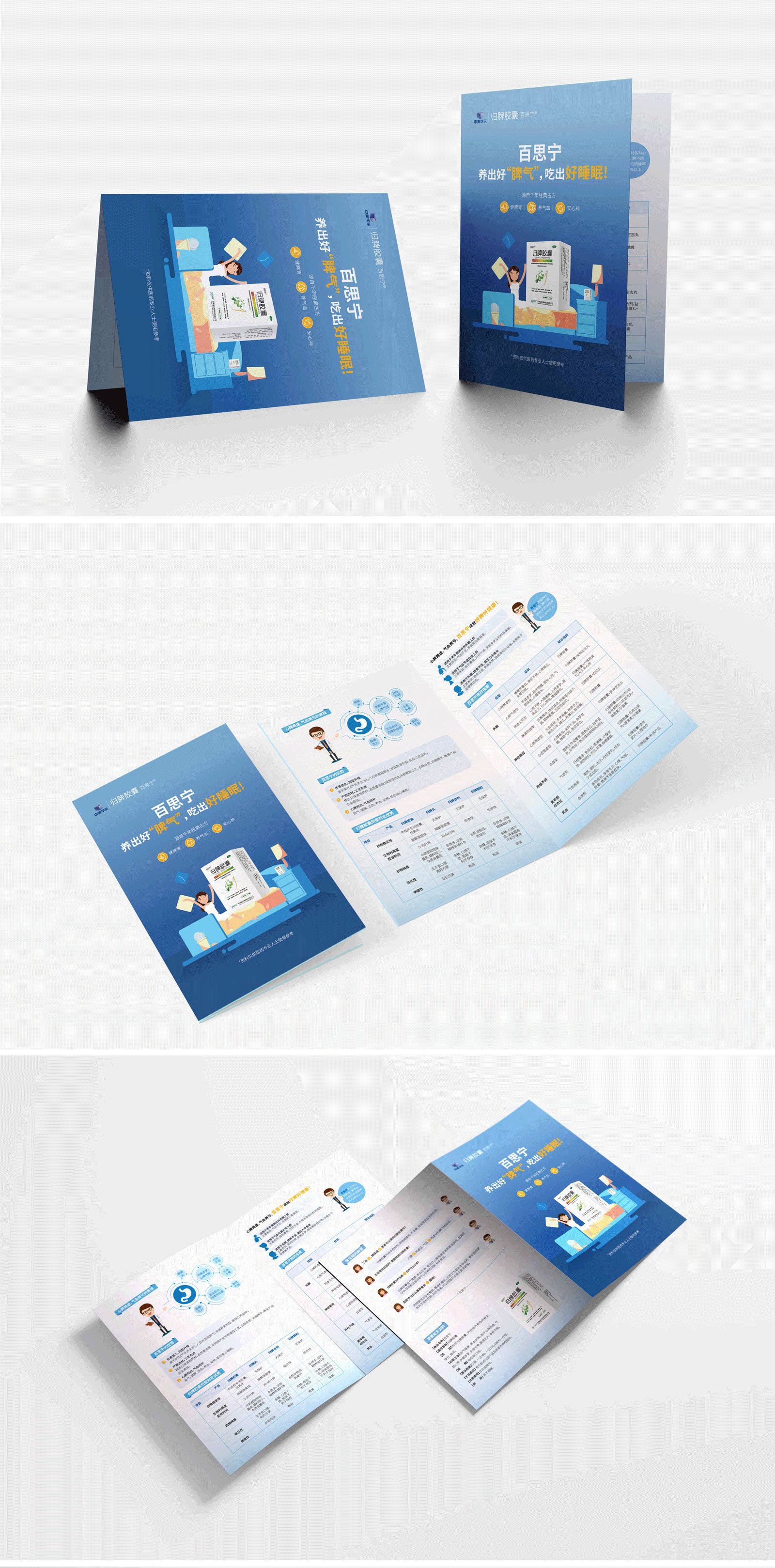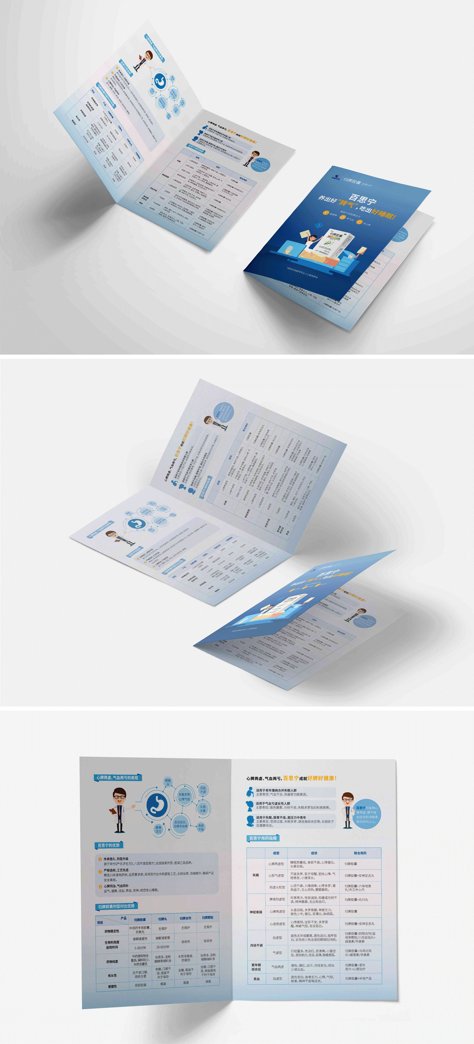 石特考慮到宣傳折頁具有針對性.獨立性和整體性的特點,因此在此次的設計中,石特根據(jù)藥品特點,藥物療效、及使用人群等方面進行構思:折頁的封面主要采用扁平化的設計風格,主畫面以“歸脾膠囊”藥物為重點,同時將產(chǎn)品賣點進行突出;在內(nèi)頁的設計上,以精煉的語言將歸脾膠囊的優(yōu)勢、用藥指南以表格進行呈現(xiàn),直觀明了,便于閱讀;除此之外,還以小圖標等形式增加畫面閱讀趣味性與可讀性。折頁總體風格簡約、主次分明、要點突出,不僅有助于加強購買者對藥品的了解.還能進一步強化廣告的效用。