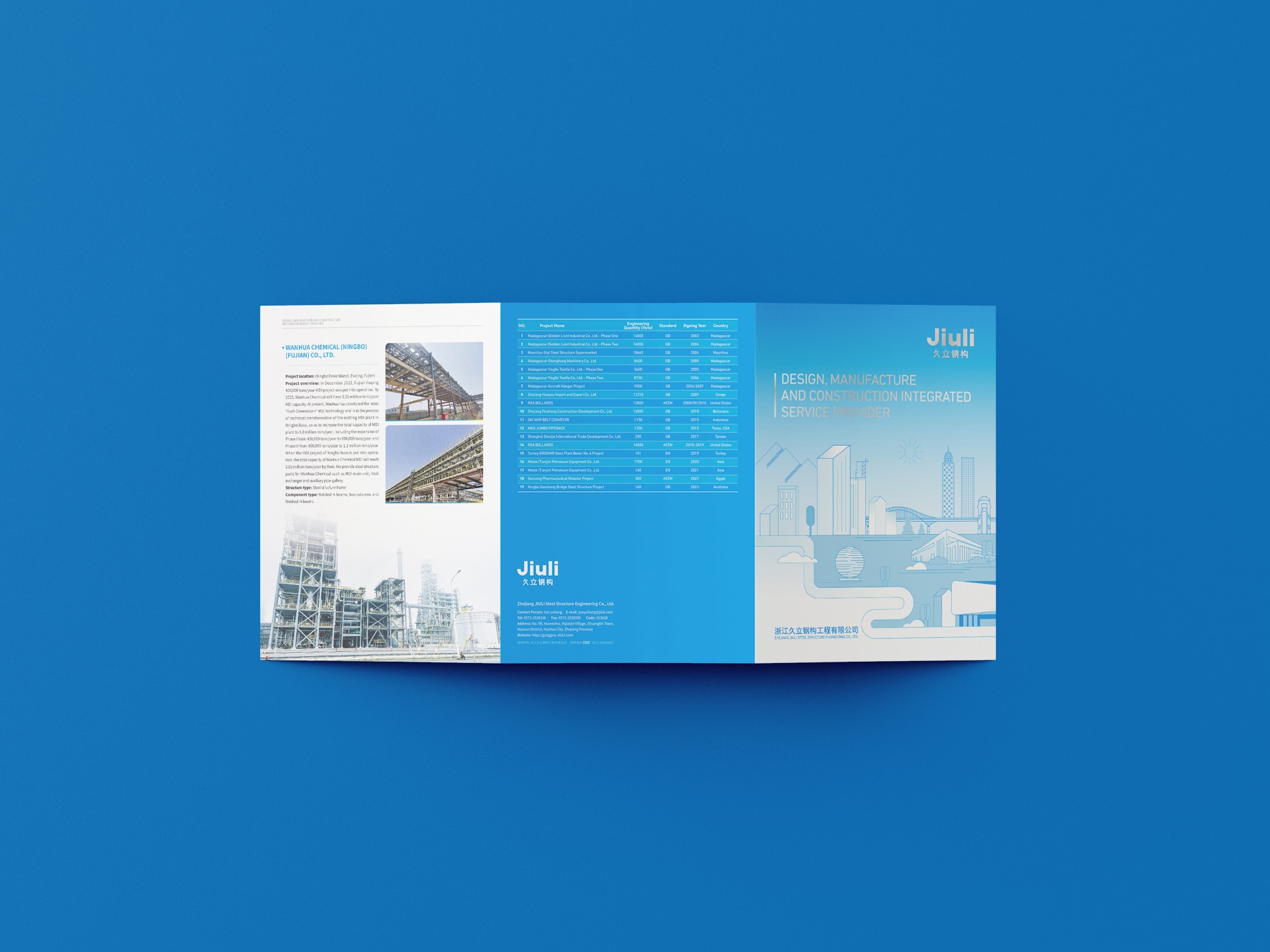 一、設計理念與目標:本次鋼結構公司宣傳三折頁設計,我們秉持專業、創新和實用的設計理念,旨在通過獨特的視覺呈現和精準的信息傳達,充分展示公司的實力、技術水平和業務范圍,樹立公司品牌形象,吸引潛在客戶的關注。