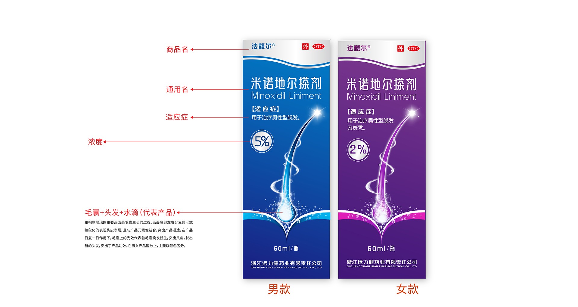 主視覺展現的主要畫面是毛囊生長的過程,畫面底部左右分叉的形式抽象化的表現頭皮表層,且與產品元秦像結合,突出產品通途,在產品日復一日作用下,毛囊上的光效代表著毛囊煥發(fā)新生,突出頭皮,長出新的頭發(fā),突出了產品功效。在男女產品區(qū)分上,主要以顏色區(qū)分。